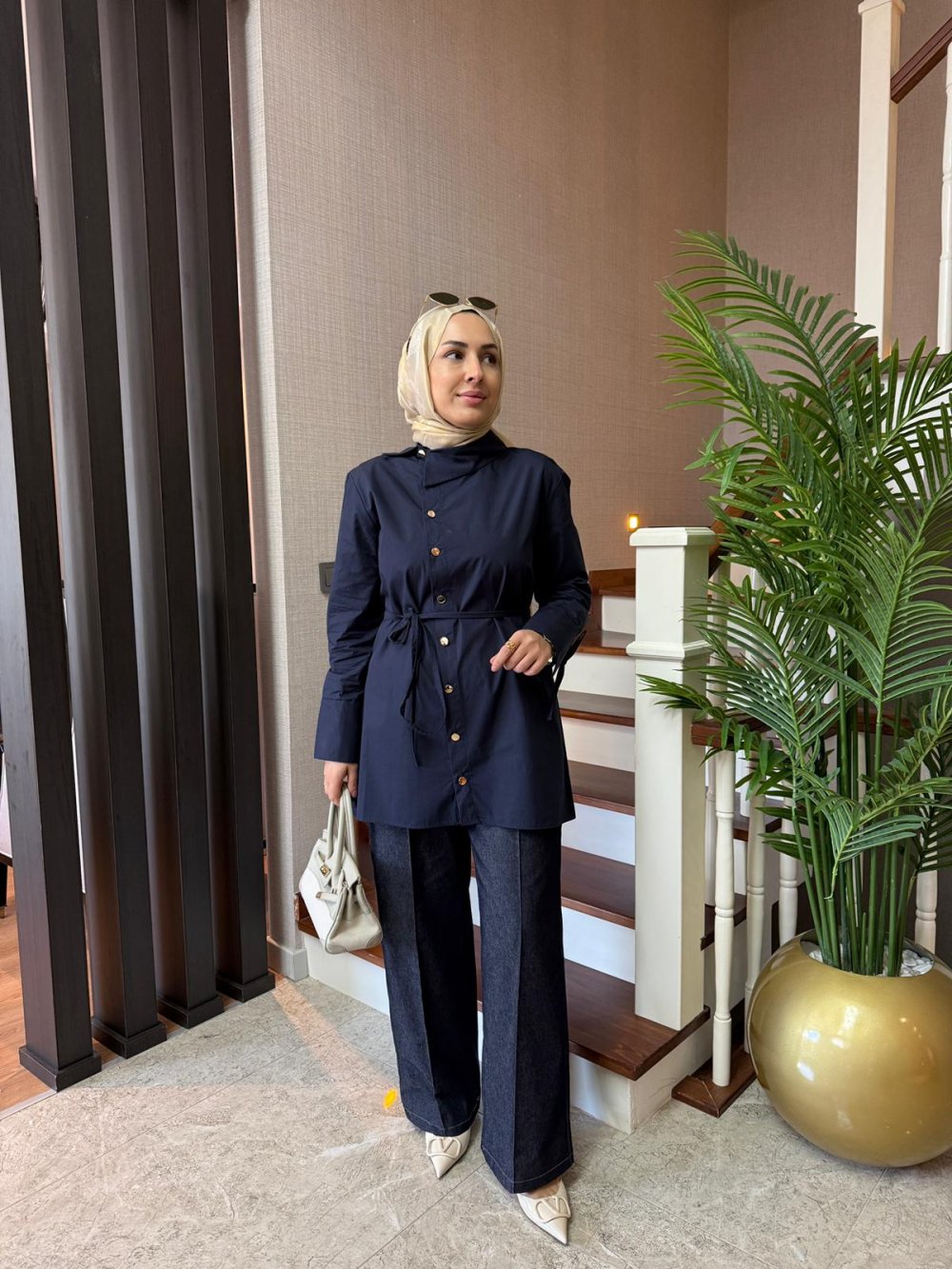 Asimetrik yakadır, gold düğme detayları bulunmaktadır. Seyyar kuşak mevcuttur.