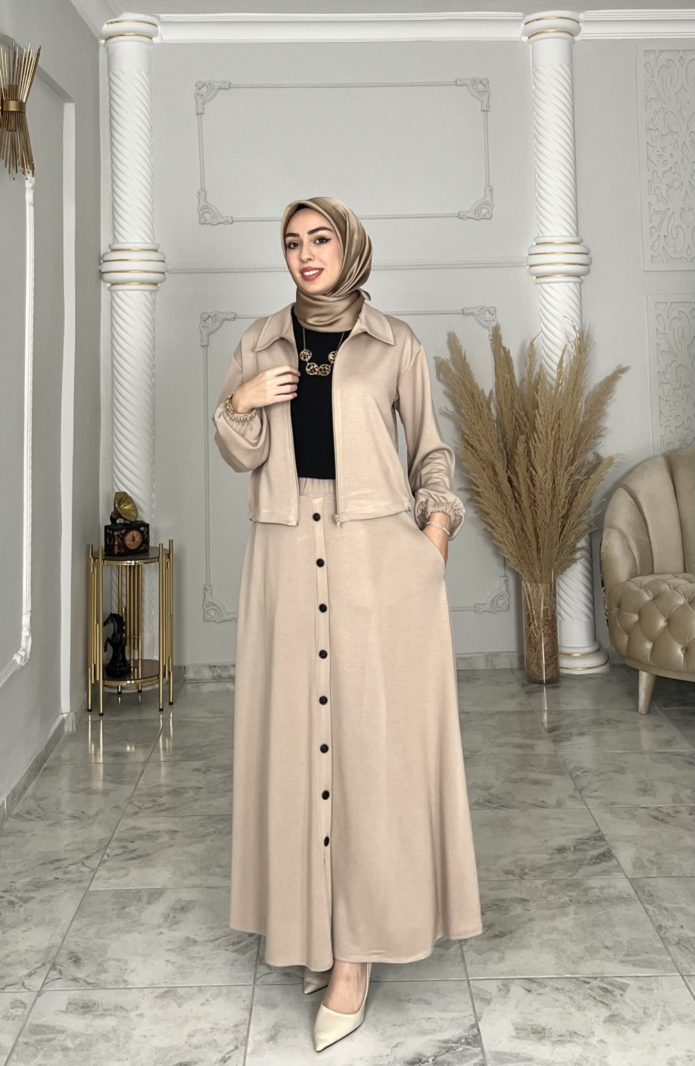 Tunik fermuarlı ,etek beli lastikli düğme görünümlüdür açılmaz
