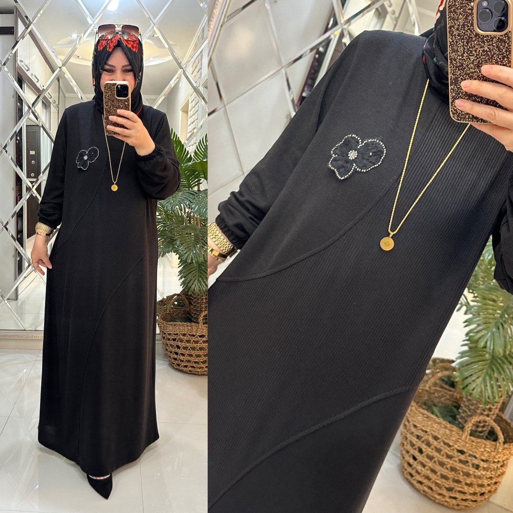 -140 cm uzunluğunda, yakasında çiçek motifi süslemeli