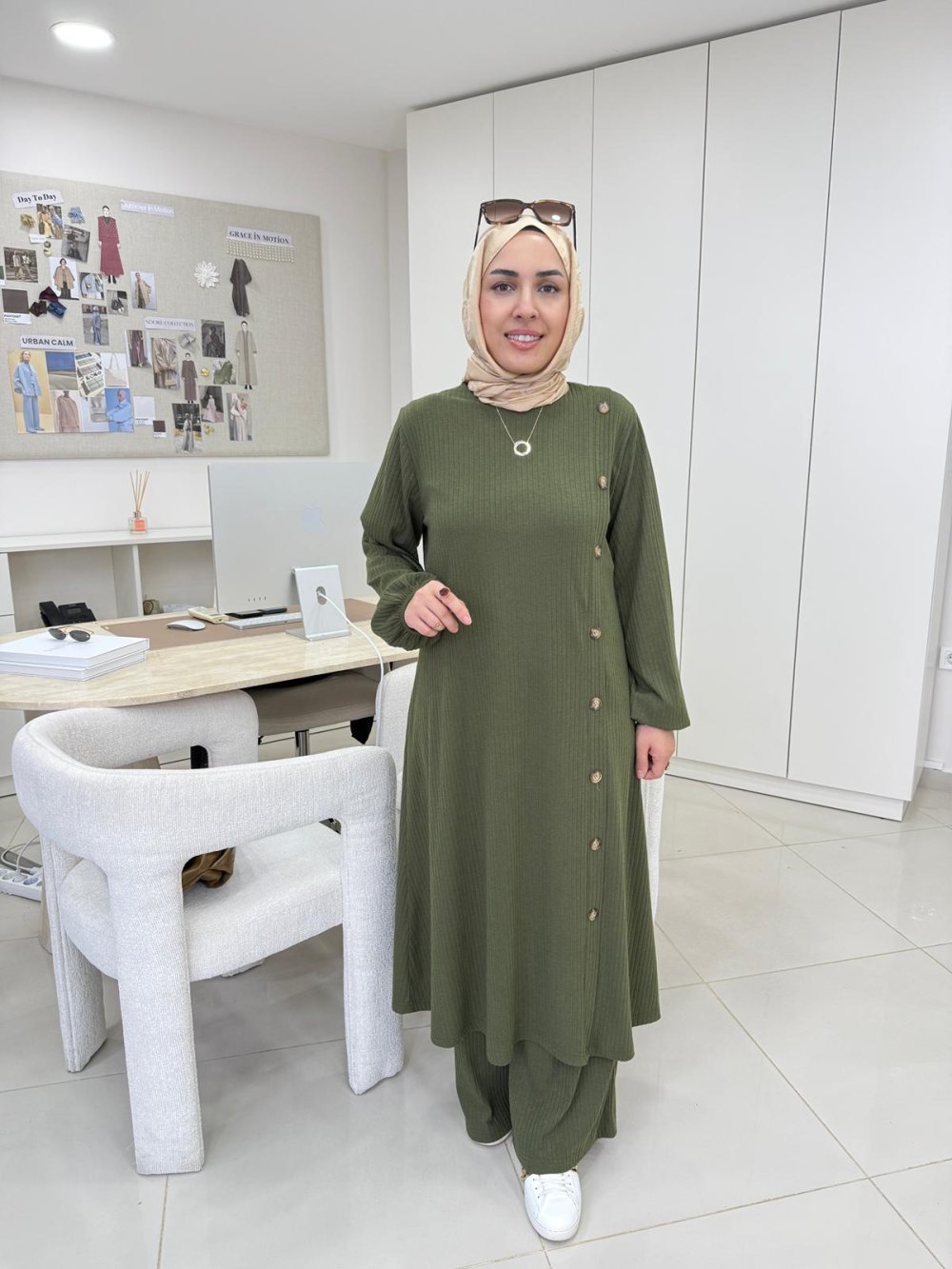 Tunik boy 120 cm’dir. Sol tarafında çubuk düğme detayı, bileklerinde lastik bulunmaktadır.