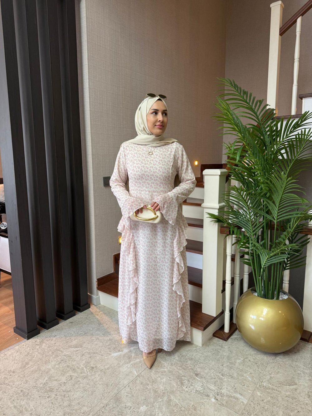 Desenli Fırfırlı Şifon Elbise Bej