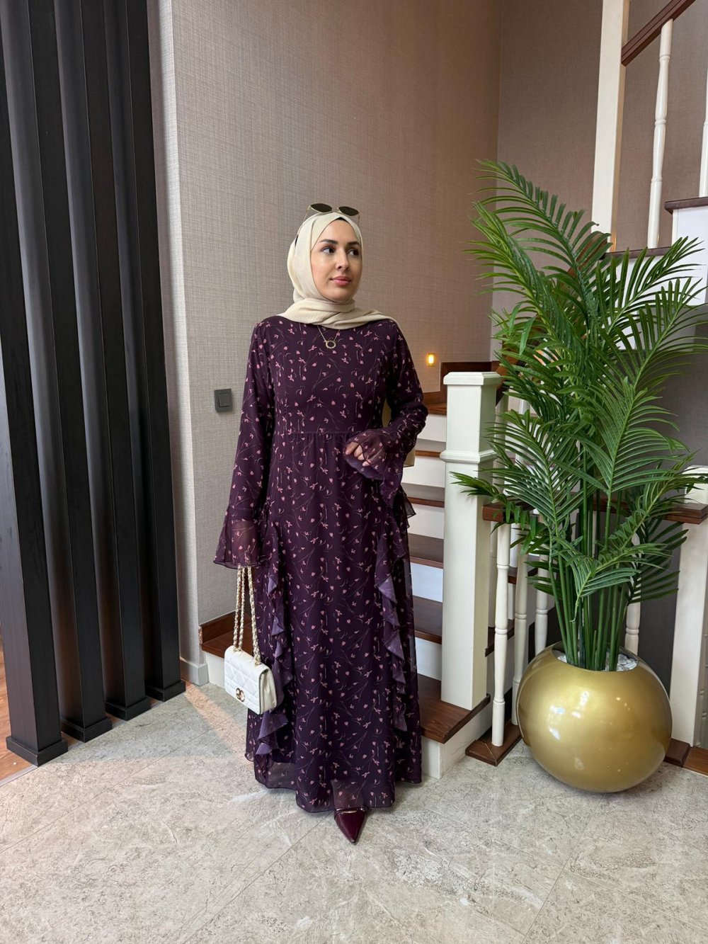 Desenli Fırfırlı Şifon Elbise Mürdüm