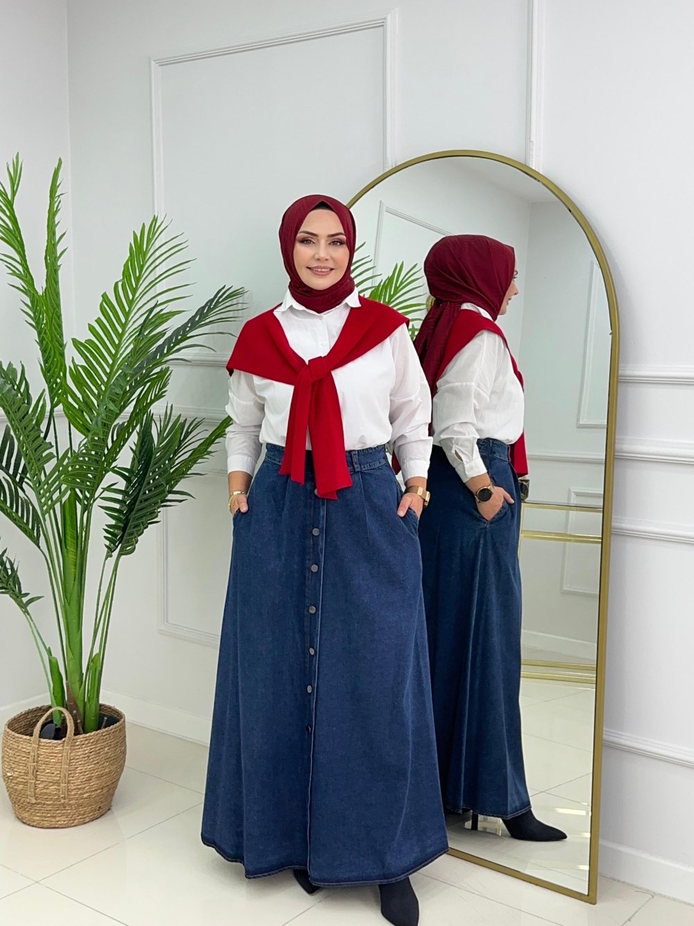 DÜĞMELİ DENİM ETEK - LACİVERT