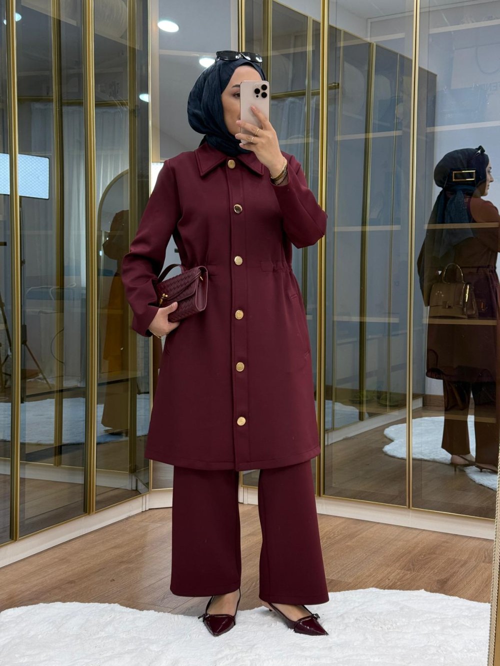 Gold Düğmeli Beli büzgülü Scuba Takım Bordo