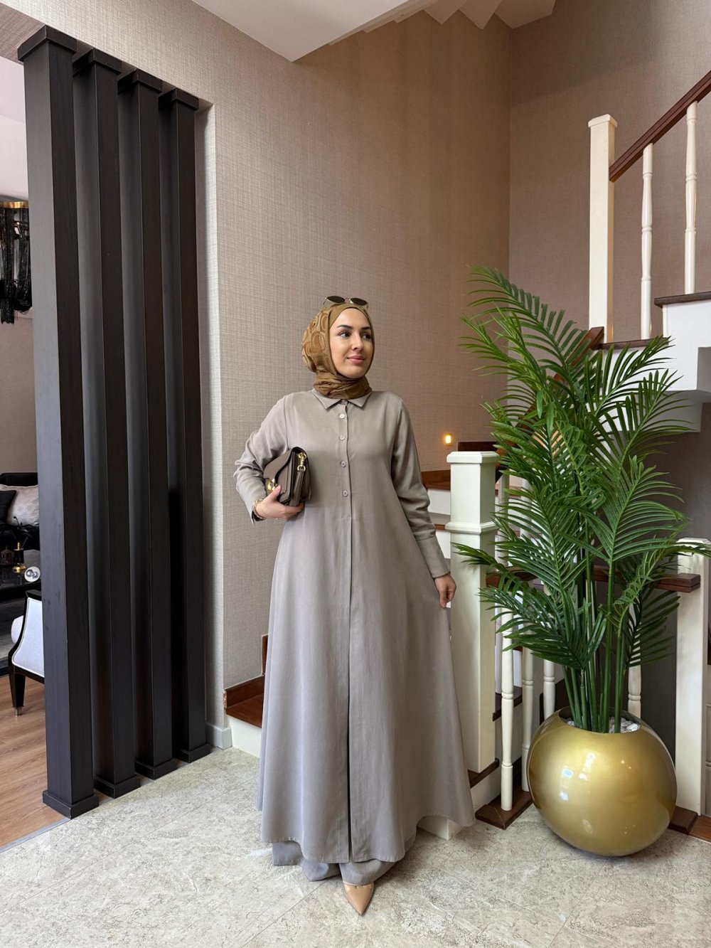 Tunik boy 138 cm’dir. Önde düğme ve yırtmaç detayı mevcuttur.