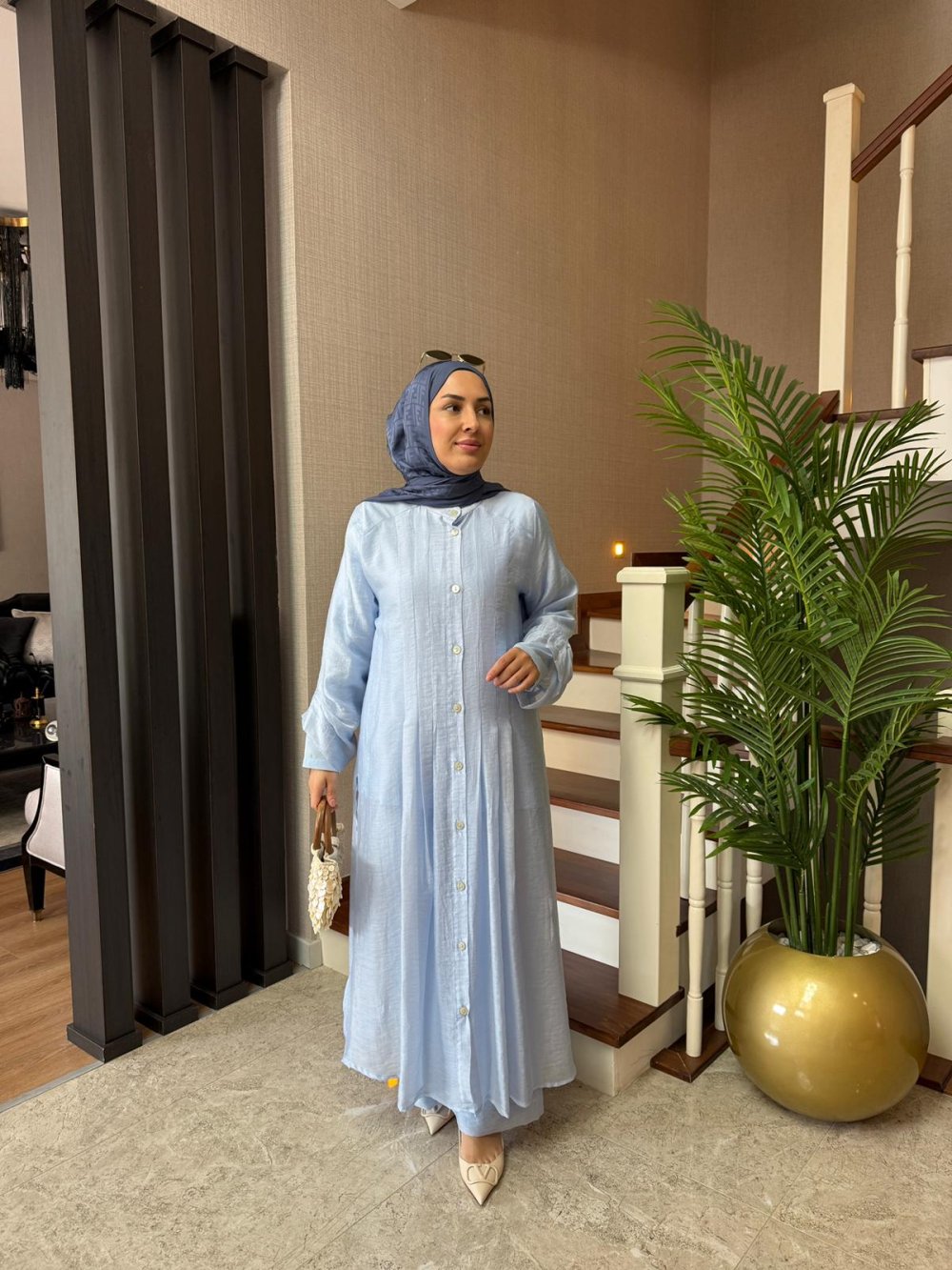 Tunik boy 125 cm’dir. Önü nervürlüdür, sedef düğme detaylıdır.