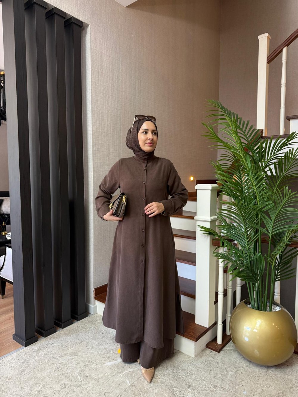 Tunik boy 125 cm’dir. Önden düğmeli, yanında cepleri ve yırtmaçları mevcuttur.
