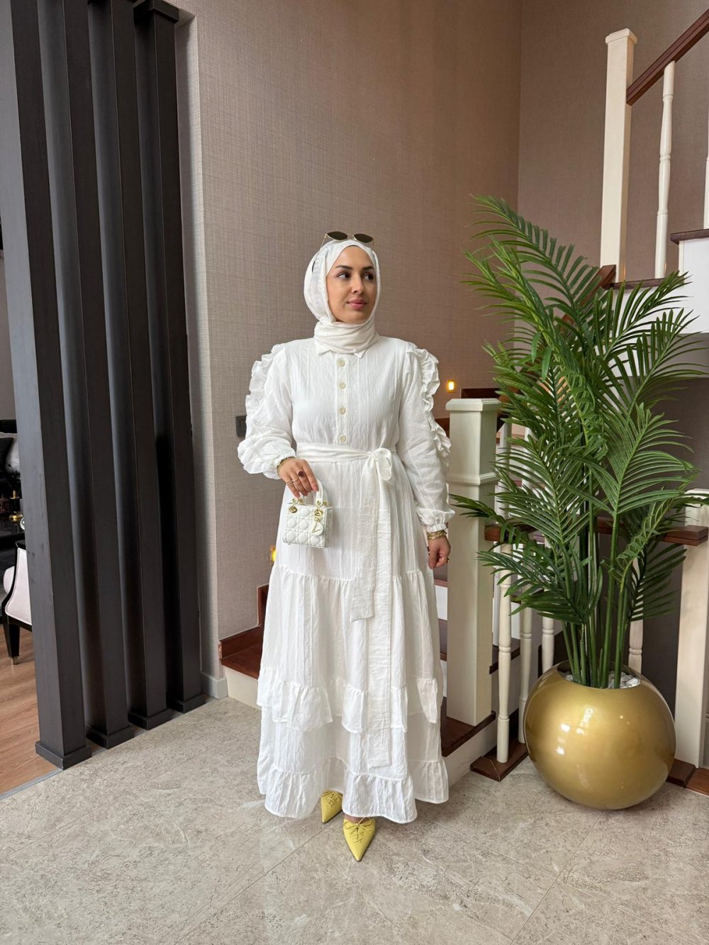 Seyyar kuşağı mevcuttur. Kollarında fırfır, etek uçlarında kat kat detayları bulunmaktadır. Kol uçları lastiklidir.