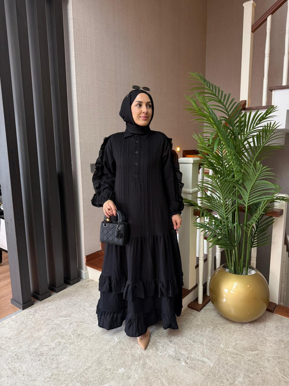 Seyyar kuşağı mevcuttur. Kollarında fırfır, etek uçlarında kat kat detayları bulunmaktadır. Kol uçları lastiklidir.