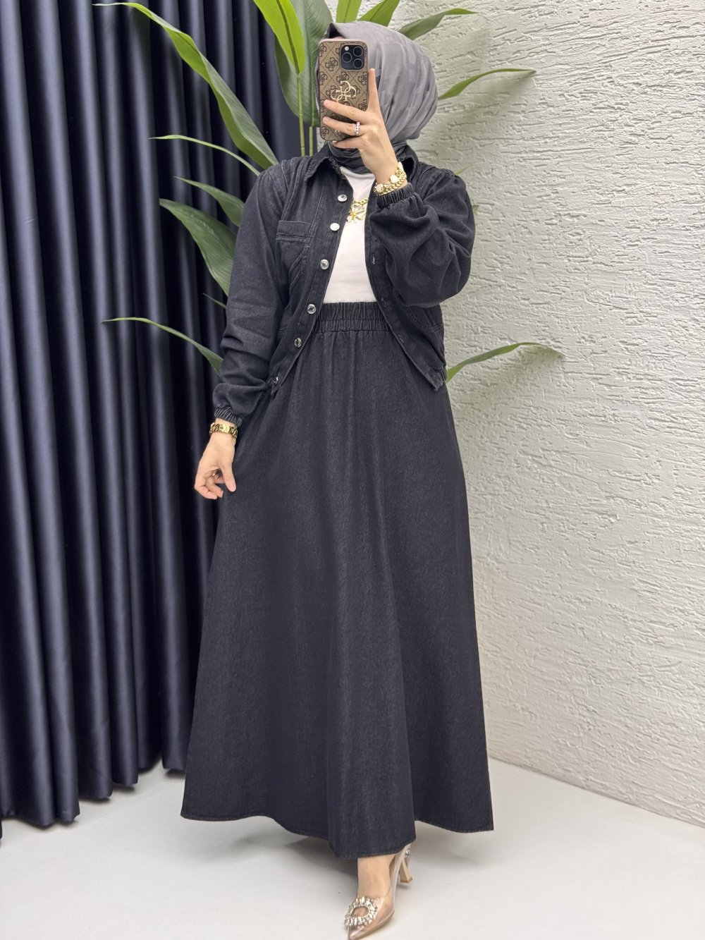Hem gömlek hem ceket olarak kullanabileceğiniz kot etekli takımımız stokta